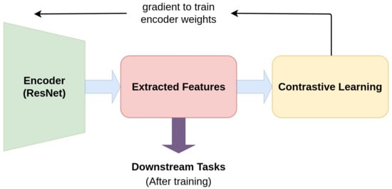 Similarly, in the work proposed by Chen et al. [42], a traditional ResNet is used as an encoder where the features are extracted from the output of the average pooling layer. Further, a shallow MLP (1 hidden layer) maps representations to a latent space where a contrastive loss is applied. For training a model for action recognition, the most common approach to extract features from a sequence of image frames is to use a 3D-ResNet as encoder [22,24].