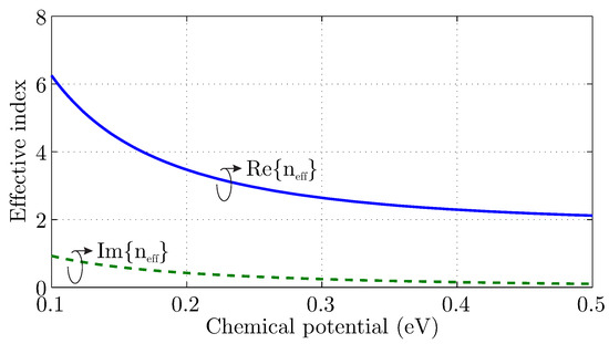 This term is important because it is a metric of the SPP wave characteristics compared to the free-space one. Specifically, the real part of the effective index indicates the confinement of the surface wave, as well as the wavelength ratio between the SPP versus the free-space waves, while the imaginary part corresponds to the propagation length. For instance, the effective index is calculated via (3) and (4) for a popular setup that includes graphene atop silicon-oxide substrate of , considering various chemical potential values at THz. The result is depicted in Figure 1, and it is observed that the SPP wavelength is almost 6 times shorter than the free-space wavelength, at the lowest chemical potential values.