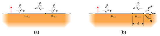 However, Fresnel equations are not completely valid, when the reflection due to graphene layer termination is examined (as in Figure 2b), since the strongly confined surface wave must be converted into a spherical one. Here, (5) yields a qualitative result for the reflection coefficient, rather than an exact result formula. Particularly, the reflection coefficient is not calculated accurately, although the mismatch is indeed stronger for larger effective index values of the graphene surface wave (namely, small values of chemical potential).