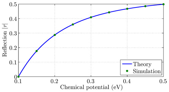First of all, the transition of a surface wave from a graphene layer with chemical potential to another one with is investigated. The chemical potential alteration results in a different effective index of the surface wave, as discussed in the previous section and depicted in Figure 2a. The reflection coefficient is extracted via the numerical algorithm at the point nearest to the edge, in order to minimize the effect of propagation losses, while is set to eV altering . The results are sketched in Figure 4, where the match with the Fresnel equation in (5) is evident, since the main attributes of the propagating surface wave are retained.