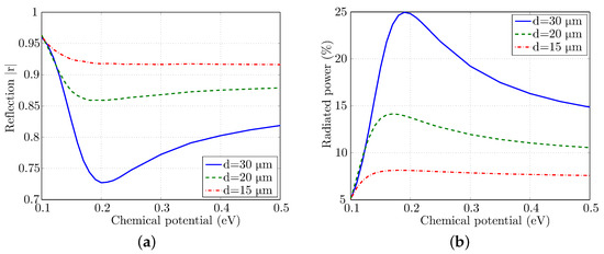 It is now obvious that a graphene surface wave of low effective index is advantageous for enhanced radiation. However, this wave is also weakly confined to the graphene surface, leading to a degradation of the device performance due to interference. Consequently, a strongly confined surface wave is required for the initial propagation, while a matching component with enhanced radiation features is included for termination, as demonstrated in Figure 2. In this setup, low values are selected for and higher ones for , in order to achieve the appropriate effective index, according to Figure 1. The performance is tested for eV and various values, as well as thicknesses d. Initially, the reflection coefficient is calculated and sketched in Figure 6a, indicating that a thicker matching component achieves better behavior. Moreover, the optimized solution is obtained for approximately eV, due to the severe mismatch between the effective indices of the surface waves for even higher values, as observed in Figure 4. Similar results are extracted via the radiation power examination in Figure 6b, validating the enhanced performance of the proposed setup. Specifically, the radiating power is augmented by almost five times compared to the setup without a matching component, for eV and m. Note a slight shift of the extreme value as the thickness d is altered, which is mainly due to the interference of the surface wave multiple reflections.