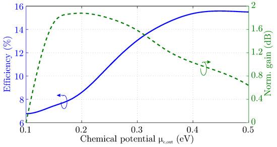 Radiation efficiency and normalized gain at the direction of desired propagation for different chemical potential values of the matching component.
