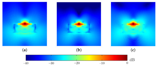 Furthermore, the electric field on the -plane is computed, in order to examine the physical aspects of radiation. In Figure 10, the corresponding amplitude is illustrated and an initial observation pertains to the increased field concentration inside the substrate, due to the higher relative permittivity value. This explains the generation of the two main lobes towards and . Additionally, the reflection due to the steep transition of SPP wave from eV towards eV (Figure 10b) is visible, since the surface wave is weak at the matching component region. For this reason, the radiation of this device is realized, mainly, via the side edges and corners of the patch, as verified by the 3D radiation pattern in Figure 11b. Here, four directive main lobes appear that correspond to the concentration of the electric field at the patch corners. The radiation pattern for the case eV in Figure 11a, also presents four lobes. Yet, their directivity is considerably decreased. The most interesting radiation pattern is observed in Figure 11c, for the antenna with a matching component of graded increment in the chemical potential. Here, it is obvious that the radiation leakage through the patch’s corners is unavoidable. Nevertheless, the main lobe is the one that corresponds to the desired direction, namely the one that the matching component is placed. Consequently, the optimized transmission of the SPP wave to free-space is accomplished.