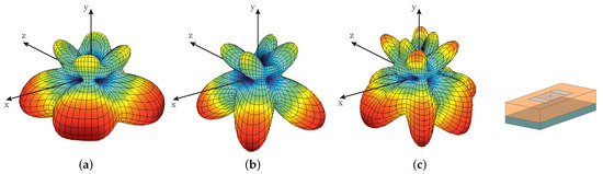 Three-dimensional radiation patterns of the proposed graphene antenna for (a) eV, (b) eV, and (c) graded increment of matching component’s chemical potential.