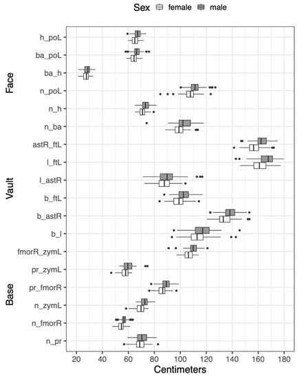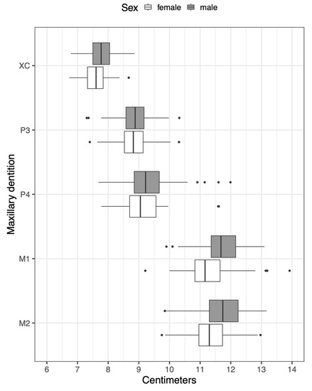 Dental metric data consisted of maximum mesiodistal dimensions of the right (or left-substituted when the right antimere was missing) maxillary canine (XC) and buccolingual breadths of the right mesial (P3) and distal (P4) premolars and first (M1) and second (M2) molars [42]. Thus, six different subsets of the data were used: (1) six metrics from the face, (2) six from the vault, (3) six from the base, (4) eighteen from the cranium (the combined face, vault, and base metrics), (5) five from the dentition, and (6) twenty-three from the total combined cranial and dental data. Tukey boxplots are used to illustrate sex differences in these metrics.