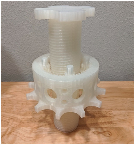 Testing was performed with the roller screw and modular testing assembly made up the test materials shown in Table 6. Although initial prototyping was done in PLA, which is the most common 3D-printed plastic, it is not dishwasher safe. PETG has a heat distortion temperature of 70 °C and vicant softening temperature of 85 °C. Most home dishwashers operate at about 49 °C, which enables PETG components (unlike PLA) to be cleaned in most home dishwashers even without annealing the 3D-printed part. Both the roller screw assembly and test rig assembly were printed with PETG using an open source Lulzbot TAZ6 3-D printer [63]. Default high-detail print settings were used in a TAZ6 3D printer with a layer height of 0.14 mm. All tests were run on PETG 3D-printed roller screws and testing rigs. An S-type load sensor was used to measure the force the screw was able to impart during actuation.