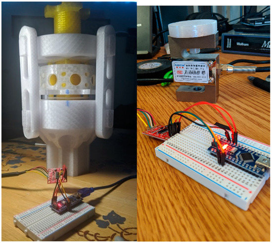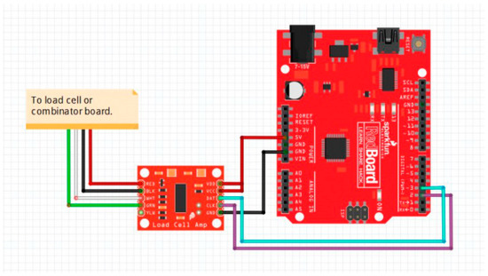 After connecting all components, then, Arduino was used to calibrate the load cell. The HX711 library was downloaded from the Arduino IDE library manager. The public domain “SparkFun_HX711_Calibration.ino” calibration code was available from the SparkFun website and can alsobe downloaded from the project github repository [62]. A 9.07 kg weight was placed on top of the load cell, and the calibration factor in the calibration code was adjusted until the output on the serial monitor matched the weight. Once the calibration was completed, the calibration factor was placed into the “run_scale.ino” code found in the same locations as the calibration code. The weight was added to the top of the load cell again to confirm that the operational code was correct.