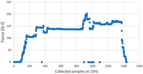 Maximum force output of planetary roller screw actuated by hand. Samples captured every 0.1 s.