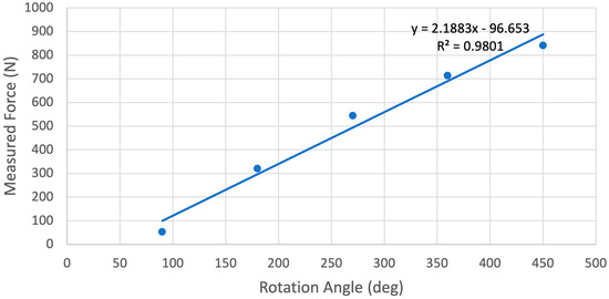 The measured force after each 90-degree rotation was averaged together and plotted in Figure 8. For every degree of rotation of the main collar, the central screw exerted on average of 2.19 N onto the load cell. The same force data are divided by the area of the 50 mm diameter pressure plate base to determine the exerted pressure and can be seen in Table 7. This version of the roller screw is able to exert approximately 428 kPa onto a flat surface. The pressure exerted by this mechanism is dependent on the area of the crushing surface; a press plate with ¼ the area would be able to deliver four times the pressure before entering the roller slippage failure mode of the current design.