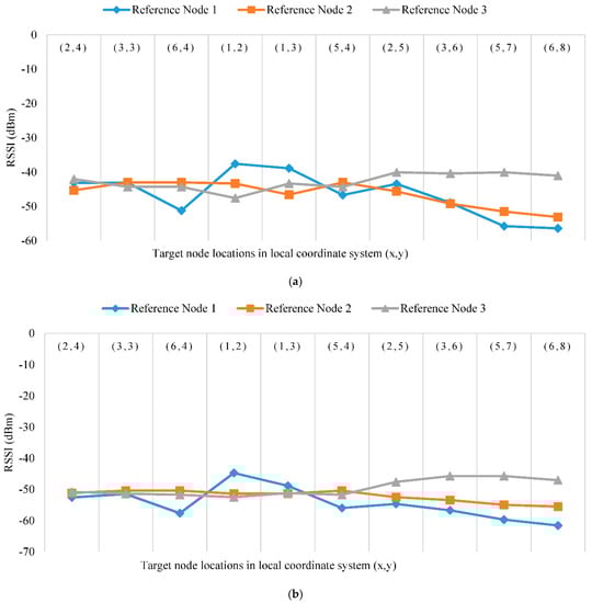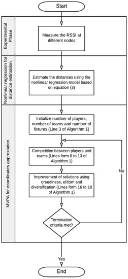 The flowchart of the proposed approach is given in Figure 1. It starts by estimating the distances of different target nodes with respect to the reference nodes based on measured RSSI. Measurements are carried out with the loop-infinite option to cater to infinite packet transmission [23]. If represents the transmitted power and denotes the path loss power at distance in dBm, then RSSI is given by: