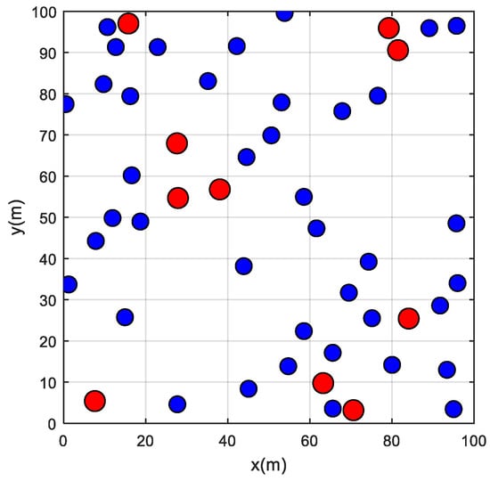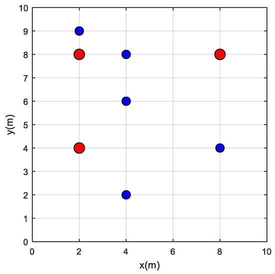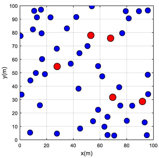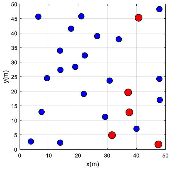 In this case, 25 nodes are generated randomly in a given space of 50 m × 50 m among these 25 nodes, 5 nodes are considered as reference nodes (i.e., their location is known and the distances from these nodes to the remaining target nodes are also known). This case is represented in Figure 4, where red and blue circles represent reference and target nodes, respectively.