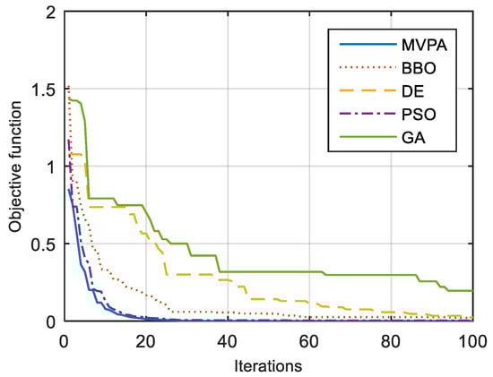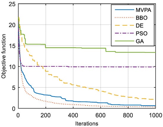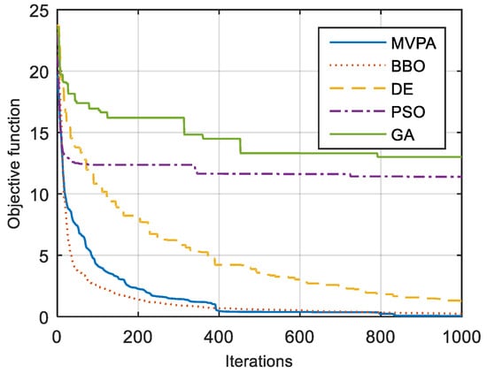 The obtained results along with the MSE for this case are tabulated in Table 3. It can be seen from this table that the MVPA was able to find the coordinates of all target points with good accuracy (less than 5 cm) except for two locations; at the same time, the remaining algorithms have struggled to do so. Moreover, the objective function minimized over the iterations is sketched in Figure 7.