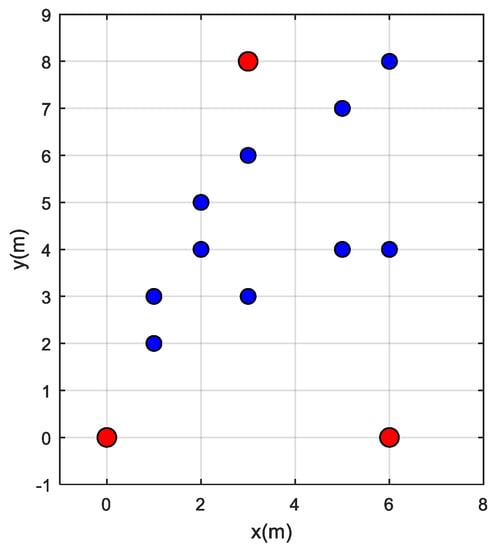 The target node was relocated to ten independent positions as shown by the blue dots in Figure 10. The coordinates of these nodes along with the distances measured between reference nodes and target nodes, in meters, are tabulated in Table 5. The last column gives the average of the distances of the target node from all three nodes.