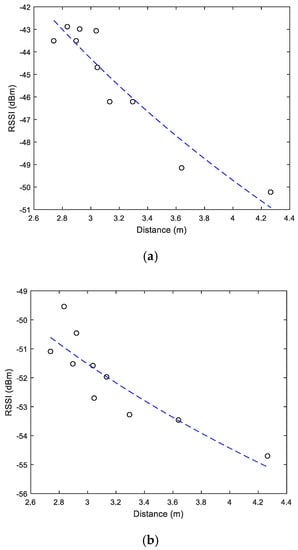 Comparing (10) and (12) with (3) reveals that the terms is equal to −23.671 (dBm) for the indoor case and −40.425 (dBm) for the outdoor case. However, the value of can be approximated to −18.78 (dBm) and −10.10 (dBm) for indoor and outdoor scenarios, respectively. Equations (10) and (12) are plotted in Figure 12a,b, respectively. It can be seen that the nonlinear curves approximate the best function such that the error function between the measured values and the approximated curve is minimized.