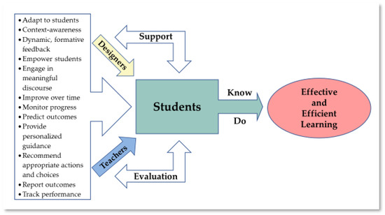 Smart learning environments (SLEs) [7] facilitate students to learn not from but with their teachers during practicing life skills in collaboration with their classmates. For a learning environment to be called smart, some conditions should be met. An SLE is enriched with suitable digital material that receives content from real-world problems and at the same time is adaptable, effective, efficient, enjoyable, and can engage students and teachers anytime and anywhere [2,3]. Developing SLEs is a software engineering process to create educational content combined with pedagogical principles [7]. The following figure visualizes the overall description of smart learning environments as rendered by Spector [23] (Figure 1). Designers and teachers collaborate to ensure that the learning materials provided are flexible and in line with students’ interests and needs, and the platform that distributes them can supply immediate feedback, improve over time, monitor effort and student performance, offer personalized tutoring, suggest solutions, and report the outcomes. Through this process, students are empowered and not only learn but also create their own learning materials.