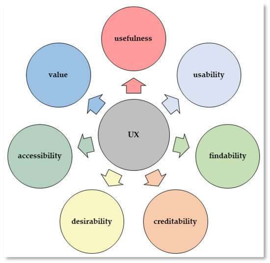 The basic axis of WUIM design was user experience (UX) and the seven factors that determine it [6,67]. At each design stage and for each of its components, the answers to the questions posed about usefulness, usability, findability, creditability, desirability, accessibility, and value justified the decisions made (Figure 3).