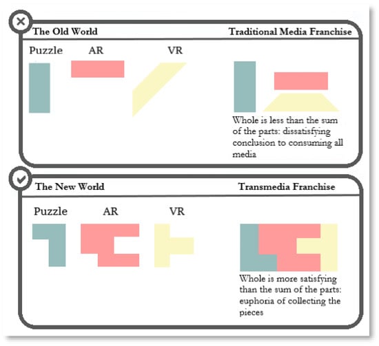 WUIM is a transmedia educational project that flows across traditional educational materials such as flashcards and puzzles, and cutting-edge technologies such as AR and VR. The most characteristic schematic interpretation of transmediality is credited to Pratten [73]. Figure 5 is an adaptation of Pratten’s figure and illustrate the transmediality of WUIM [67]. Transmedia narratives consist of multiple distribution channels that contribute to the creation of a single experience. Each medium is combined by the audience as a piece of a puzzle to complete the story of the transmedia narrative. In our case, puzzles, AR, and VR are combined by children to create a comprehensive learning experience.