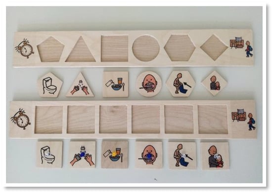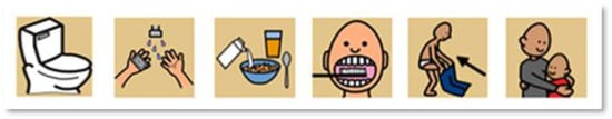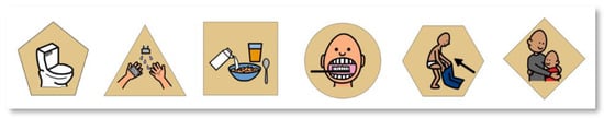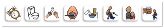 Under the permission of Tobii Dynavox Picture Communication Symbols® (PCS), we chose specific symbols from the Boardmaker collection that serve the story flow, focusing on personal hygiene rules and social norms: alarm clock, toilet, handwashing, breakfast, toothbrushing, dressing up, parent hugs, and walking to school (Figure 7).