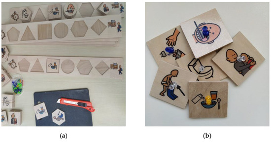 Both levels provide material with handles (pins) to support students with fine motor skill difficulties (Figure 13). Figure 14 shows the complete traditional educational material: wooden boards-wedges that make up the WUIM-Puzzle.