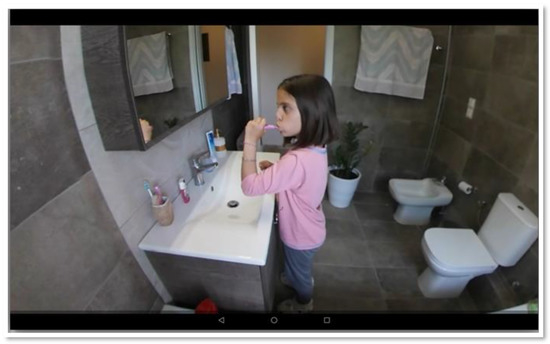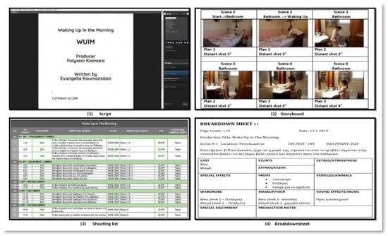For film production, three basic steps were followed: pre-production, production, and post-production [84]. In the pre-production phase, script, storyboard, shooting list, and breakdown sheets were prepared. The script was developed with the program Fade In Professional Screenwriting Software© that is a friendly-user application and the most advanced software used by professionals (https://www.fadeinpro.com/ (accessed on 2 June 2021)) (Figure 15). According to the script, there are two actors, a 10-year-old girl named Vicky, who is the main character, and her mother. Vicky (game avatar), once she is out of bed, follows a series of events guided by everyday logic: first she goes to the bathroom/toilet and, after washing her hands, heads to the kitchen to have breakfast. When breakfast is over, she gets back to the bathroom, where she brushes her teeth. She then goes to her bedroom, takes off her pajamas, puts on her clothes and heads to the front door area where she puts on her shoes, picks up her school bag, greets her mom, and opens the front door to go to school [67].