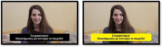 The theoretical framework and background of this conclusion is the dual-coding theory [46]. An example of the dual-coding theory is subtitling, which in addition to the primary obvious need that it came to cover, namely translation, is also a valuable vocabulary learning tool (verbal and nonverbal/auditory–visual encodings) [47,48]. Moreover, subtitles for the deaf and hard of hearing (SDH) are necessary for people with hearing difficulties and are enforced by the deaf community and legislation [49] (article 67, Greek Law 4488/2017). Multimedia processing requires less cognitive load than static illustrations and a multimedia content is more interesting, entertaining, and motivating than paper-based pictures and text [17,18]. Mayer’s Cognitive Theory of Multimedia Learning [17] includes 12 basic (Table 2) and nine advanced (Table 3) principles for multimedia learning environments design [14].