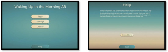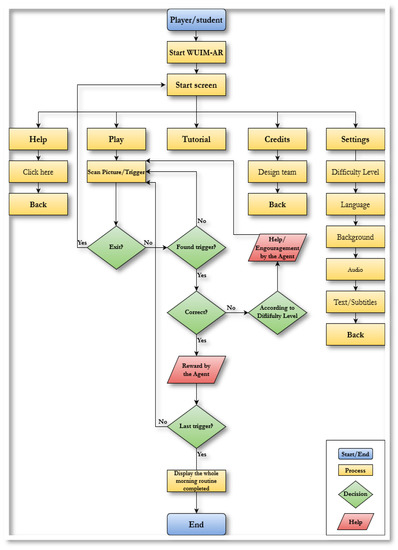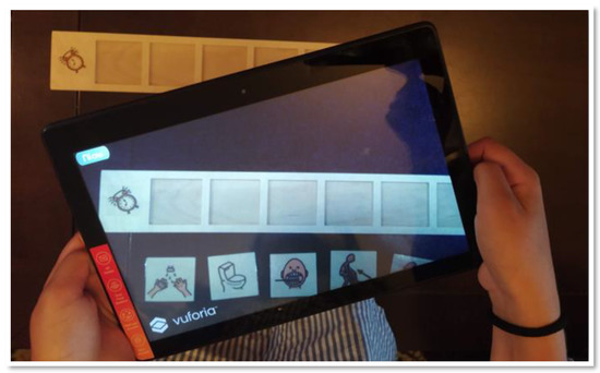 The educational design was based on the holistic, integrated, and experiential approach of three domain of learning according to Bloom’s taxonomy [74]: cognitive (knowledge-based), practical—psychomotor (action-based), and affective (emotion-based). WUIM-Puzzle and WUIM-AR are based on behaviorist learning theory which relies on the connections between stimuli and responses [6]. Learning is enhanced by task analysis, contiguity, practice, repetition, sequencing, reinforcement as extrinsic motivation, and feedback [75]. Task analysis method and chaining are basic training strategies for daily living activities within the Applied Behavior Analysis (ABA) approach [76]. In practice, learning is achieved through a systematic series of trial-and-error action. However, WUIM-Puzzle also relies on directed discovery learning which is a constructivist approach [77,78]. WUIM-VR is based on unstructured discovery learning. Bruner [77] pointed out that children can experience success or failure, not as a reward or punishment respectively as indicated by the behaviorism, but as an additional piece of information that will lead them to knowledge. In sum, for all three versions, the aim is for students to learn the correct sequence of activities from waking up in the morning to get ready to leave the house and go to school. The ultimate goal of WUIM is for students to transfer the acquired morning routine skills to real life. Learning is achieved not by punishments (loss of lives or points) if children do not make the right choice but by enhancing intrinsic motivation through the dynamic elements of games and the unique features of augmented and virtual reality. This process does not discourage students and is one of the most effective ways to keep playing, trying to figure out the combination of activities. Besides learning outcomes, objectives are to foster collaborative learning, according to Vygotskian’s social-constructivist approach [79], to motivate teachers and students to develop their own educational material through easy-to-use applications and to develop positive attitudes for both inclusive education, as well as for digital educational games.