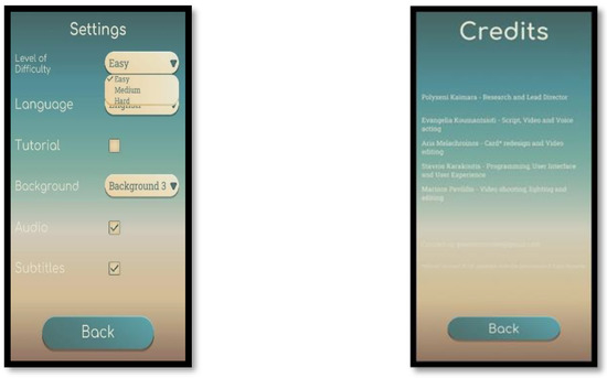 - Kaimara, P.; Miliotis, G.; Deliyannis, I.; Fokides, E.; Oikonomou, A.; Papadopoulou, A.; Floros, A. Waking-up in the morning: A gamified simulation in the context of learning activities of daily living. Technol. Disabil. 2019, 31, 195–198. [Google Scholar] [CrossRef]