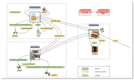 WUIM deals with a real-life situation: learning the morning routine at home. The morning routine is a key part of the functional skills that lead to independent living. WUIM includes hygiene-related activities that must be followed in a specific order, such as “I wash my hands after using the toilet”, or “I brush my teeth after eating”. For the VR version, content is related to saving resources and time. For example, “I eat breakfast wearing pajamas” because there is a chance to get dirty. In this case, “I change and I put on my clothes”. Otherwise, if “I eat wearing the clothes and get dirty, then I have to undress, put the clothes in the laundry and try to find and wear other clothes”. Within WUIM there are rules of social behavior, such as “I greet my parent before I go to school”.