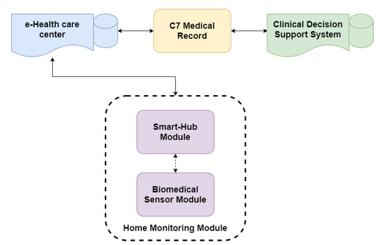- A home monitoring module, composed of medical devices and a smart-hub system;
