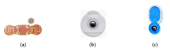 Figure 3. Types of electrodes: (a) patch supplied with the sensor (180 × 45 mm); (b) traditional electrodes (32 × 36 mm); (c) paediatric electrodes (34 × 40.8 mm).
