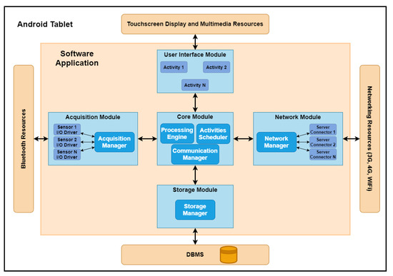 The software application is organised in a series of modules, to implement all the functionalities required by the project: usability, data acquisition through BT, data upload and configuration download through WiFi and 3G/4G LTE, fault tolerance (avoiding losing data) and security.