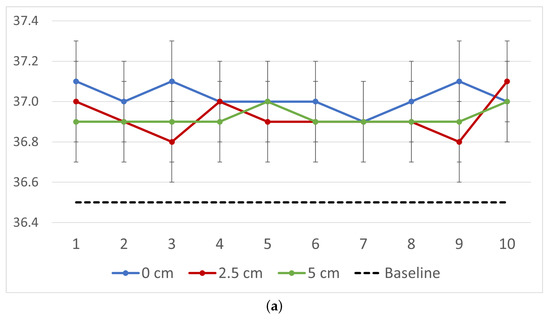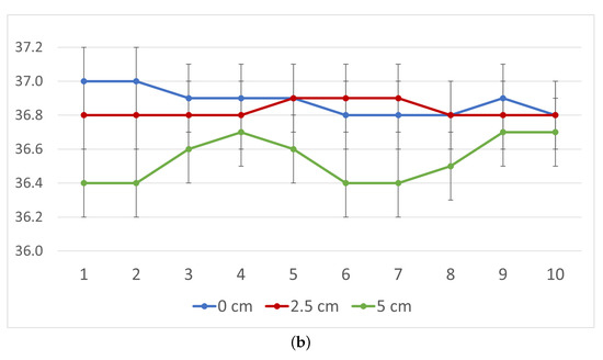 Trend of 10 body temperature measurements with the same device, at different distances from the patient’s forehead: (a) excess of the measured value in a subject with a temperature of 36.5 °C; (b) variability in the measured value according to the distance from the patient’s forehead.