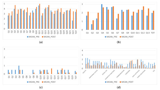 Mean results of the questionnaires provided to the users pre- and post-telemonitoring: (a) PGWBI, composed of 22 questions on well-being, with score from 0 (low) to 5 (high); (b) PSQI, composed of 13 questions on sleep quality, with score from 0 (bad) to 3 (good); (c) BDI, composed of 19 questions on depression, with score from 0 (good) to 3 (depressed); (d) PedsQL, composed of 36 questions regarding different fields of babies QoL, with score from 0 (no problems) to 4 (always a problem).