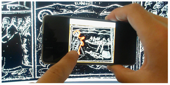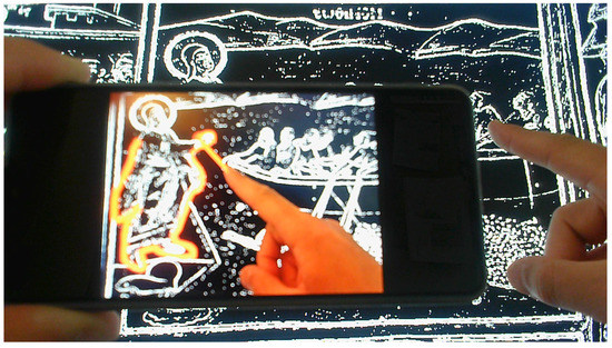 As mentioned above (Section 4.1), the application needs to scan, through the device’s camera, part of the monument in order to recognize the paintings and provide position and orientation tracking in it. In this case, in order to perform the scanning, the user has to point with the device towards the desired location and hold it constantly until the scan has ended. In the special case when MR headsets are used, the headsets’ cameras scan the environment as users move, look and explore the monument and so users do not have to perform any additional action than just look around and enjoy the experience. Additionally, the holographic display provides more space for the visual elements to be projected and increases the interaction space. An important functionality provided by such MR headsets (e.g., Microsoft Holonens 2), is the hand tracking and the gestures’ recognition which enables users to engage with their applications by using hand gestures.