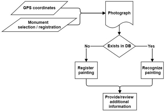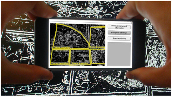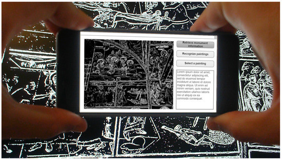Once the monument is recognized, visitor positioning is performed in order to assist users in finding the existing items of interest, e.g., paintings. It is stated that for the support of the available interpretative options in a monument, this particular monument must be already mapped and registered in the system’s database. When the visitor points the device towards an area of a known monument or a specific item of interest, the application captures its image and uses it in order to perform the item recognition so that relevant information can be retrieved.