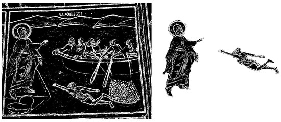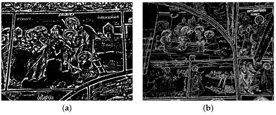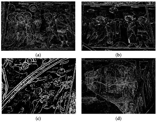 Nevertheless, not all Crucifixion paintings are the same. Four such paintings (frescoes actually) from four different churches in the area of Epirus, Greece, are depicted in Figure 6. These frescoes are photographed using a smartphone (so it is evident that there is no processing regarding angles, cropping contours, etc.). They are depicted here not in the original form but after going through an edge detection processing and a transformation to black/white using Gimp [46]. The reason for this “transformation” is to focus on the critical aspects of the painted theme.