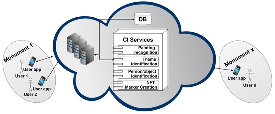The proposed framework takes advantage of the proliferation of powerful smartphones, the new horizons envisaged by the Fifth Generation of Telecommunications (5G) [18,19], and the availability of cloud/fog computing [20,21] capabilities (including artificial intelligence and Machine Learning (ML) [22,23]) close to the end-user that allow us to envision Digital Culture scenarios where a user may enter a Byzantine monument and receive essential information about it by capturing its interior using his/her smart device. For example, a photograph captured with any ordinary smartphone could then be sent to a cloud/fog computing service that will detect each captured theme and its location inside the particular monument. Subsequently, according to the particular requirements set by the user, certain information will be received back (e.g., concerning a particular image, recommending a full/short/theme-based tour in the monument, etc.). An interesting case arises in collaboration-based applications (e.g., crowdsourcing [24]) where images from previous visitors are stored—perhaps edited by people that are aware of specific details regarding the particular monument—and then processed to provide improved results to the end-user.