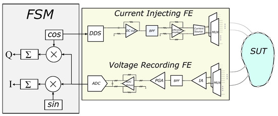 Basic EIT hardware concept. The SUT, current injecting front-end (FE), voltage recording FE, and the finite state machine (FSM) are included.