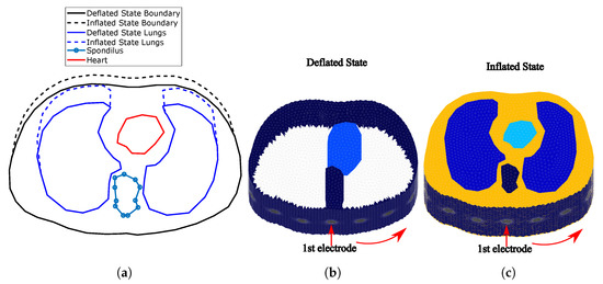 For the inflated 3D F.E. thoracic model (i.e., state where the lungs are air-filled), we assumed a chest boundary movement of and a lung cross-section area increase of (see Figure 2a)). These values fall into the ranges described in [43]. The 3D F.E. model was created accordingly, as shown in Figure 2c). In both models, we have assumed two different electrode placements. In the first, electrodes were accurately placed on the 4th intercostal height (i.e., in the middle of each F.E. model’s total height, ). In the second one, an electrode position error has been added, assuming that the electrodes present a height and a angle std around their nominal values used in the first configuration. Furthermore, for both placements, circular electrodes of radius 0.05 (arbitrary unit—AU) and 0.03 AU are considered. These configurations were added in order to examine the effect of electrodes’ placement error and their size in the signal and the reconstructed images’ quality. The numbers of nodes and elements per model and electrode configuration are shown in Table 2.