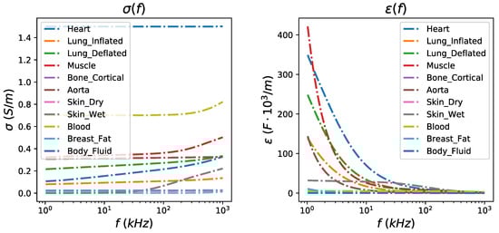 The thoracic SUT was simulated by implementing two fine (dense) 3D F.E. models, representing the full-exhalation (deflated) and the full-inhalation (inflated) lung states respectively (Figure 2). Both models were implemented in MATLAB using the NETGEN tool [39]. Each model includes the following tissues: left lung, right lung, heart, vertebra, skin, and the (muscle-plasma) background. Each tissue’s conductivity and permittivity were loaded from a database demonstrated in [40,41,42], according to the current signal frequency selection (i.e., the frequency of the current signal produced from the VCCS). The corresponding conductivities and permittivities per frequency between 1 kHz and 1 MHz are demonstrated in Figure 3. In this particular work, we have examined measurement (current signal) frequencies of 15 kHz (low frequency case) and 100 kHz (medium frequency case). For each one of these two frequencies, we assigned the corresponding and values to each 3D F.E. model’s element, according to which one of the mentioned tissues corresponds. To take into consideration possible inhomogeneity in each particular tissue, a standard deviation () of for the muscle-plasma background and the heart, for the lungs, and for the skin and bones were assumed. The nominal values assigned to each tissue along with the are shown in Table 1.