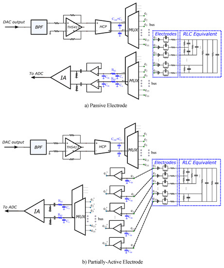 The analogue SPICE circuitry current injecting front-end consists of a second-order multiple feedback wideband band pass filter (BPF), a fully differential voltage output driver (THS413-Texas Instruments), and an enhanced mirrored Howland current pump (HPC) which acts as a VCCS. The voltage recording front-end is implemented as a partially active electrode, exclusively in the 100 kHz input signal case, and as a typical passive electrode for both the 15 kHz and 100 kHz input signal cases. In the active electrode configuration, each electrode is directly connected to a buffer (which is placed very close to the electrode). Then, each buffer’s output is connected to the IA through analogue (bi-directional) multiplexer switches (ADG426 analogue devices) and two first-order high-pass filters (one per IA input channel). In the passive electrode configuration, each electrode is directly connected to two ADG426 analogue multiplexers, one for each differential measurement channel. Each ADG426 output is connected to a buffer and each buffer’s output is driven to the corresponding input of the AD8421 IA through a first-order high-pass filter. The mirrored HPC VCCS is connected to the electrodes through two ADG426 multiplexers (one for the source and one for the sink electrode) in both the active and passive electrode configurations. The multiplexer switches on resistors are included in the ADG426 SPICE model, while parasitic capacitances (randomly chosen in the range of 100–200 pF) between the electrode channels have been manually added in SPICE, in order to simulate parasitic effects. Furthermore, to include channel imbalance effects at the output (i.e., common signal effects), unequal resistors (20–60 ) have been introduced to each measurement channel. Finally, the electrodes are modelled as in [28], according to the descriptions in [47,48,49] (assuming AgCl electrodes). A brief schematic of both configurations, including the parasitic effects and channel impedances, is presented in Figure 4.