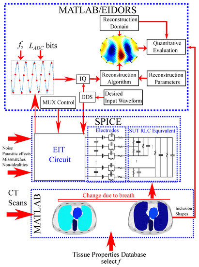 An EIT simulation interface which makes use of Python, MATLAB, and LT SPICE software is applied in order to evaluate the impact of modelling, parasitic, and noise effects in thoracic imaging. The SUT is modelled as a fine F.E. structure, which is transformed to a multiport RLC circuitry block and merged in the analogue SPICE EIT circuitry. Transient and noise simulations are carried out in LT SPICE, while MATLAB creates the input data (input sinusoidal waveform and digital signals for the multiplexers’ control) and handles the output SPICE transient data to simulate the digital EIT hardware part. Configurations of the electrodes and the signal sampling are considered, and comparison of the results is performed. Simulations showed the significant effect of the channels’ impedances at low frequencies and passive-electrode configurations in reconstructions as well as the effect of the parasitic channels’ capacitors at higher frequencies. The active electrode configuration can compensate for these effects, while increasing the demodulation filter taps can increase the acquired signal and, as a result, the reconstructed image quality. This interface can be used as a valuable tool in EIT system design for prior estimation of custom EIT system performance under different analogue and digital part characteristics.