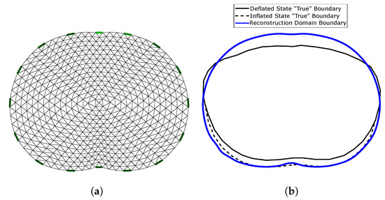 The reconstruction domain is a triangular element 2D thoracic shape mesh, shown in Figure 6a. The gap electrode model has been applied in this domain to model the electrodes [54,55]. Shape mismatch between the true (cross-section 3D) boundary and the reconstruction domain’s boundary (, Figure 6b) introduces a minor modelling error. However, the exact thoracic shape is never accurately known, and it also changes during the breath cycle [4,11].