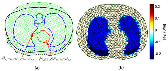 where are the nodal potentials for the corresponding model, is the element-assembled matrix, and express the complete electrode model (CEM) boundary conditions [44], and refers to the nodes where the measurements are taken [45]. Furthermore, is the voltage measurement vector, and is the current injected per electrode. By writing , it can be proved that [25,28]