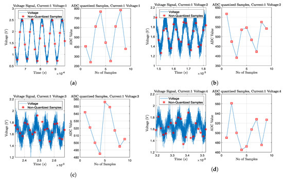 when at deflated state, acting at 15 kHz, 2mAp−p current signal, and considering 0.05 radius passive electrodes without position deviation. Sampling and quantization is performed for 2 sine periods, as shown in each right part. Current is injected from the 1st and the 2nd electrodes (adjacent current protocol). The ADC resolution is considered at 12-bit (10-bit ENOB) with a 3.3 V reference voltage. (a) Adjacent voltage measuring between the 3rd and the 4th electrodes. (b) Adjacent voltage measuring between the 4th and the 5th electrodes. (c) Adjacent voltage measuring between the 5th and the 6th electrodes. (d) Adjacent voltage measuring between the 6th and the 7th electrodes. As the voltage measuring electrode pair becomes far from the current injecting pair, the noise effect becomes more significant, due to the signal’s amplitude decrease.
