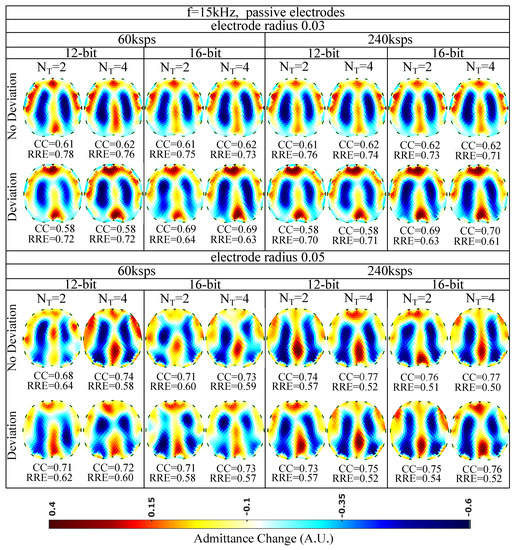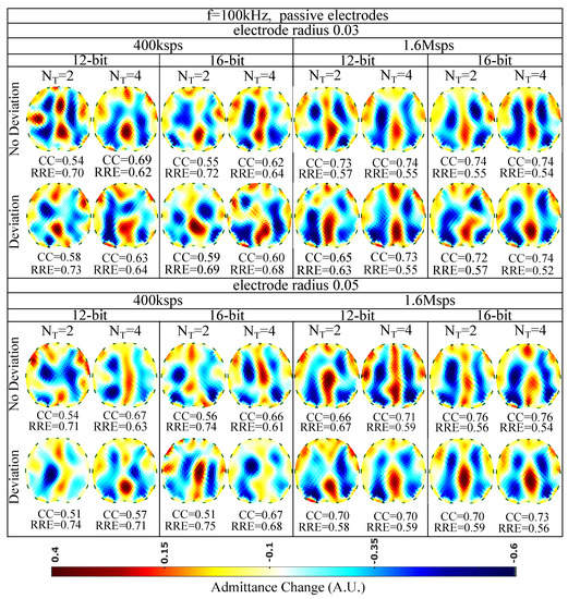 Overall, for the 15 kHz passive electrode case and high white noise levels, we conclude that the electrode radius and the total number of taps per measurement (proportional to and ) are two key factors for the image reconstruction performance. In addition, according to (19), for lower analogue circuitry noise levels, the ADC resolution is also expected to boost the performance. However, such a case has not been simulated in this particular work.