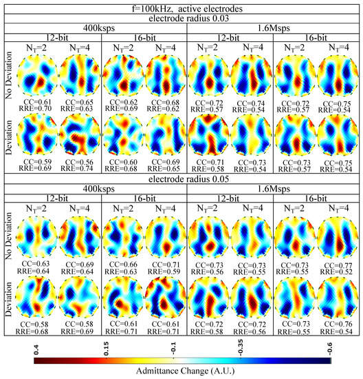 The EIT images for kHz and the active (on the voltage recording part) electrode configuration are finally shown in Figure 11. A slight improvement of the image quality is detected, mainly due to the reduction of cable parasitic effects at the voltage measurement channels. The maximum of (corresponding minimum of ) is achieved for non-deviated, radius electrodes, when a 16 bit resolution ADC is utilized, sampling at Msps for sine periods. As in the passive electrode cases, the performance is less affected by the electrode deviation and the ADC resolution and mostly affected by the total number of taps per measurement channel. In addition, the electrode surface has minor effect on the performance, due to the lower contact impedances presented at kHz.