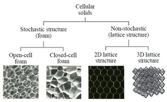 The first step in our approach is to study the different models and algorithms for creating a complex porous structure. The model must allow the pseudo-stochastic generation of interconnected solid cells. This notion of pseudo-stochastic is essential, on the one hand, to mimic the internal random geometry of the soil, and, on the other, to be able to replicate the monolith model. In addition, the mathematical model makes it possible to generate an open-cell porous structure that allows for the circulation of water or living organisms (plants, fauna, fungi, etc.) within the monolith. As the monolith models are designed for 3D printing, the notion of lattices and foams, which are commonly used for this manufacturing technique, is emphasized. A lattice structure is an architecture formed by an array of spatial periodic unit cells with edges and faces, and they are often linked to cellular solids [28]. A foam is an architecture formed by a stochastic array of cells. Figure 2 shows the different categories of cellular solids.