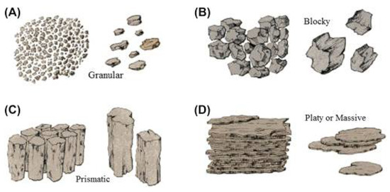 Basic types of aggregate arrangements. (A) granular; (B) blocky; (C) prismatic; (D) massive [34].