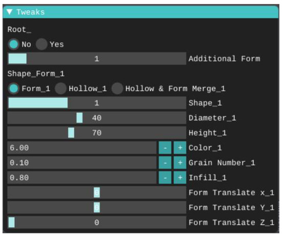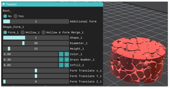 In order to allow the creation of a customizable porous structure, i.e., a monolith, a script has been developed in the Lua language [36] which should be loaded in the IceSL software. This script is open-source and available on https://github.com/RomainBedell/Porous_medium_generator (accessed on 29 June 2021). The generated monolith model is a pseudo-random trabecular structure (open-cell) in which different cylindrical forms can be generated and customized. To facilitate the use of this script, a GUI has been developed that gives the user the control to configure the desired monolith. Figure 4 shows this interface while Table 2 explains the functionality of each parameter.